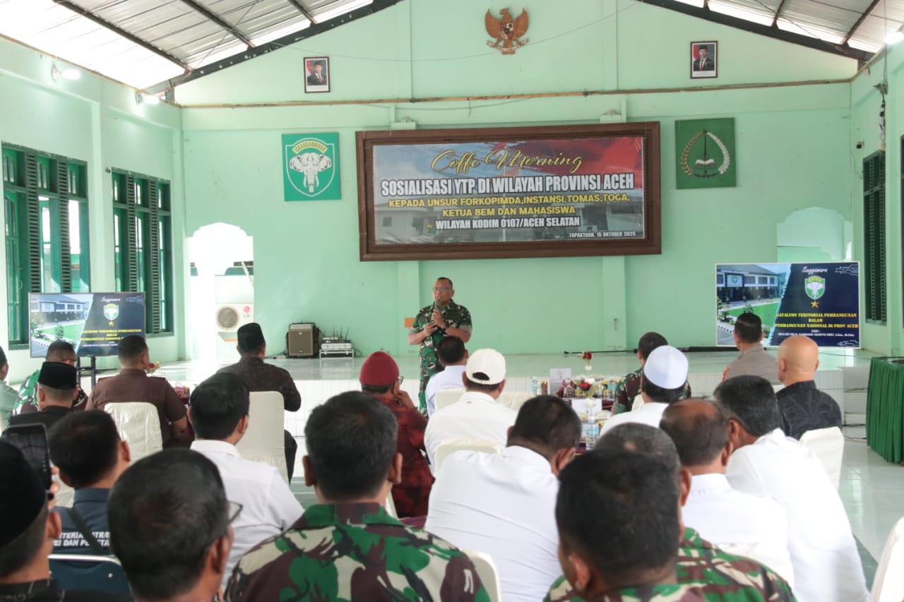 Aceh Selatan – Komando Daerah Militer Iskandar Muda (Kodam IM) menggelar kegiatan Sosialisasi Pembentukan Batalyon Teritorial Pembangunan (YTP) bagi masyarakat Kabupaten Aceh Selatan, bertempat di Aula Makodim 0107/Aceh Selatan, Rabu (15/10/2025).