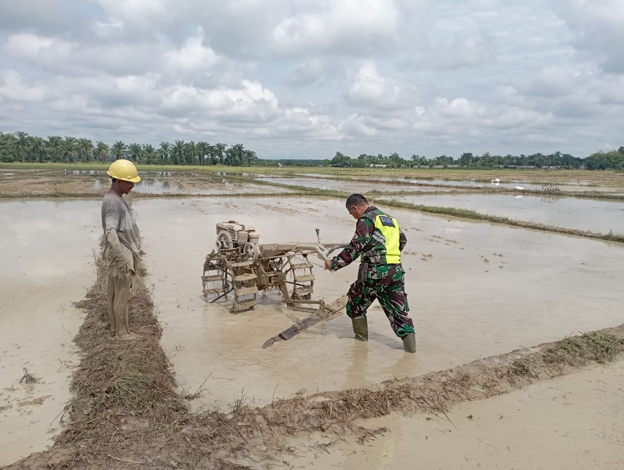 ACEH TAMIANG,MEDIA CENTER DIM 0117/ATAM- Babinsa Koramil 02/Karang Baru Serda Hendrik Siregar melaksanakan pendampingan pengolahan lahan sawah yang akan di tanami padi dengan menggunakan alat bajak modern hand traktor dilahan milik petani di Paya Kulbi, Kecamatan Karang Baru, Kabupaten Aceh Tamiang. Kamis (16/10/2025)