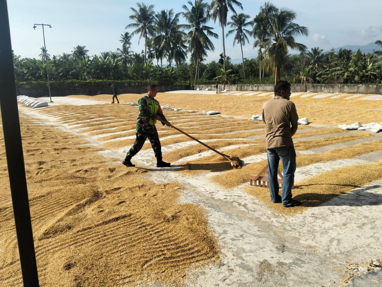 Lebih lanjut,”beberapa kegiatan dalam penanganan pasca panen yaitu pengeringan, karena kegiatan ini erat sekali dengan serangan jamur jika pengeringannya tidak dilakukan dengan maksimal.dalam menyikapi hal tersebut, Babinsa melaksanakan kegiatan pendampingan Hanpangan menjemur padi bersama petani.