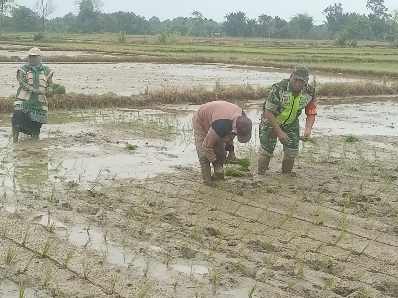 *Nagan Raya*- Babinsa Koramil 02/Seunagan Kodim 0116/Nara Sertu Latih Suprobo bantu Petani menanam padi di Desa Alu Tho Kecamatan Seunagan Kabupaten Nagan Raya,Senin (03/10/2025).