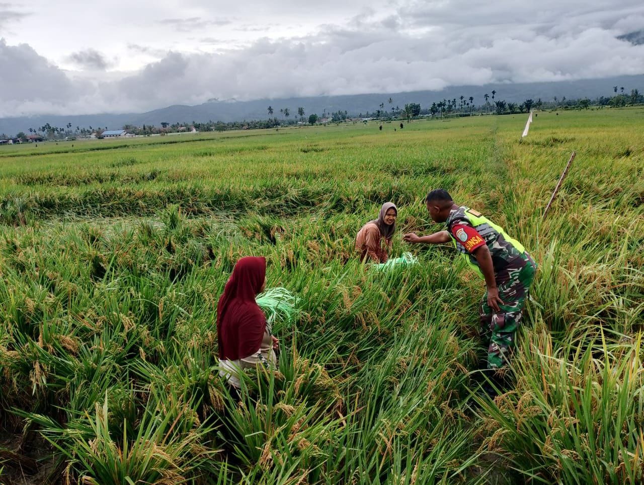 Kutacane – Babinsa Koramil 0108-07/ Semadam Koptu Fajri jajaran Kodim 0108/Agara membantu masyarakat mendirikan dan mengikat padi yang roboh akibat angin milik saudari Sabimah di desa Lawe beringin gayo Kecamatan semadam Kabupaten Aceh Tenggara, Selasa (04/11/2025).