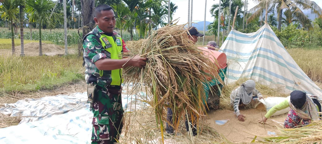 Kutacane – Babinsa Posramil Lawe Bulan Sertu Muslim jajaran Kodim 0108/Agara Membantu warga melaksanakan panen dan rontok padi di desa Lawe kulok.kec Lawe Bulan Kabupaten Aceh Tenggara, Kamis (06/11/2025).