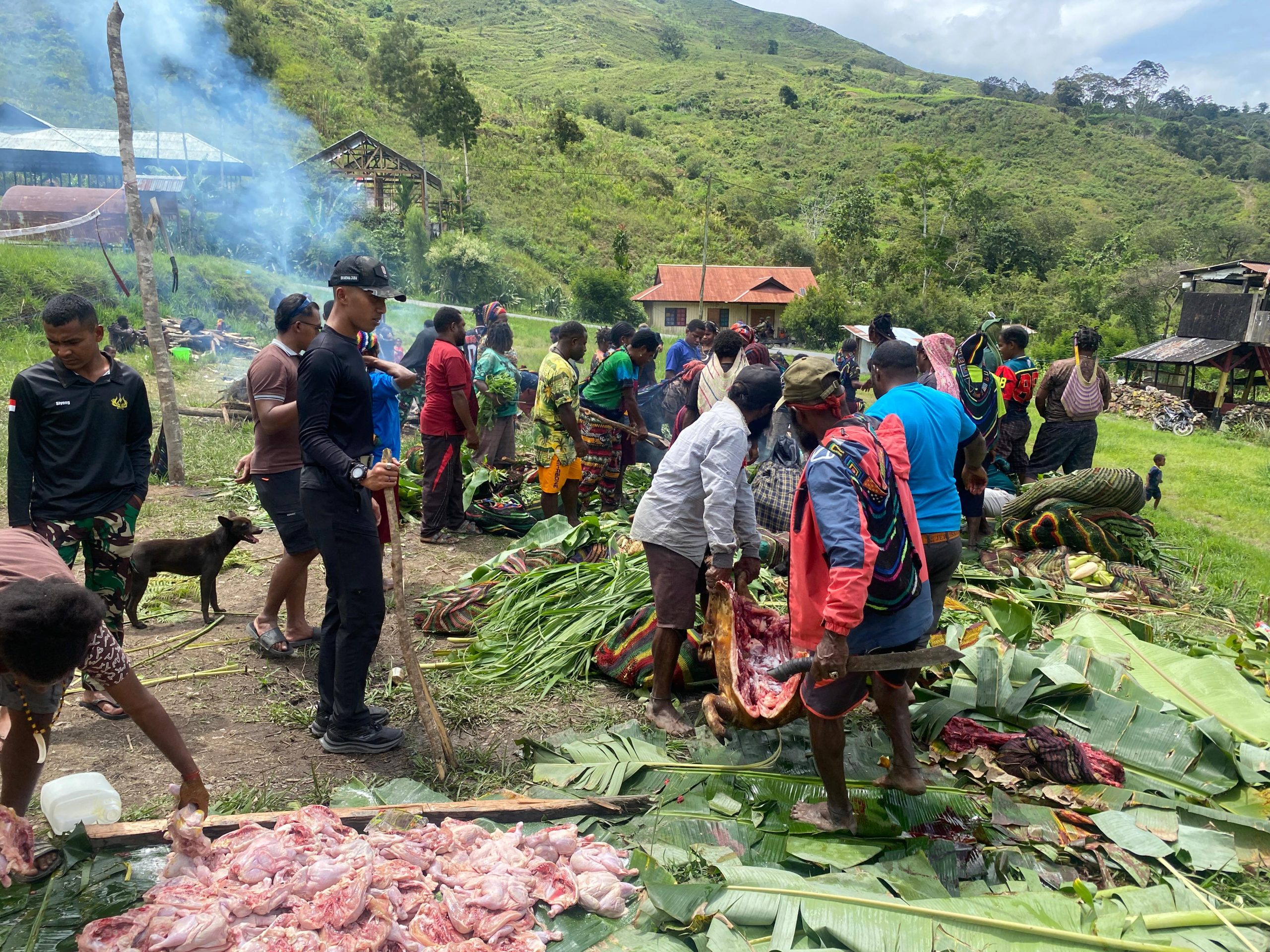 Puncak Jaya – Pos Tinggi Nambut Satgas Yonif 112/DJ, Satgas Mandala VI, Koramil, Pos Polisi dan Warga Tingginambut Gelar Tradisi Adat Bakar Batu untuk mempererat Persatuan dan Kesatuan di Distrik Tinggi Nambut Kab. Puncak Jaya Prov. Papua Tengah, Sabtu (20/12/2025).