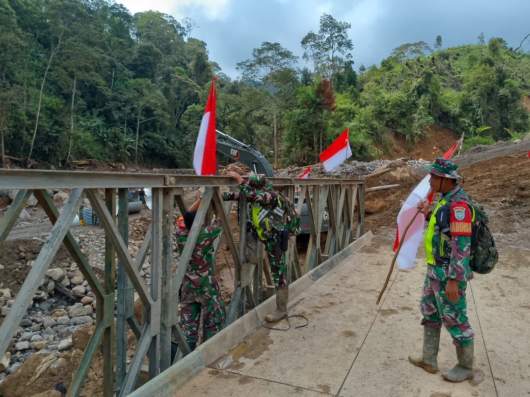 Dandim 0119/BM Letkol Inf Ahmad Fauzi mengatakan. Hingga kini, pekerjaan utama seperti pemasangan rangka baja Bailey, struktur lantai jembatan, serta penguatan pondasi dan abutment telah selesai dilaksanakan.