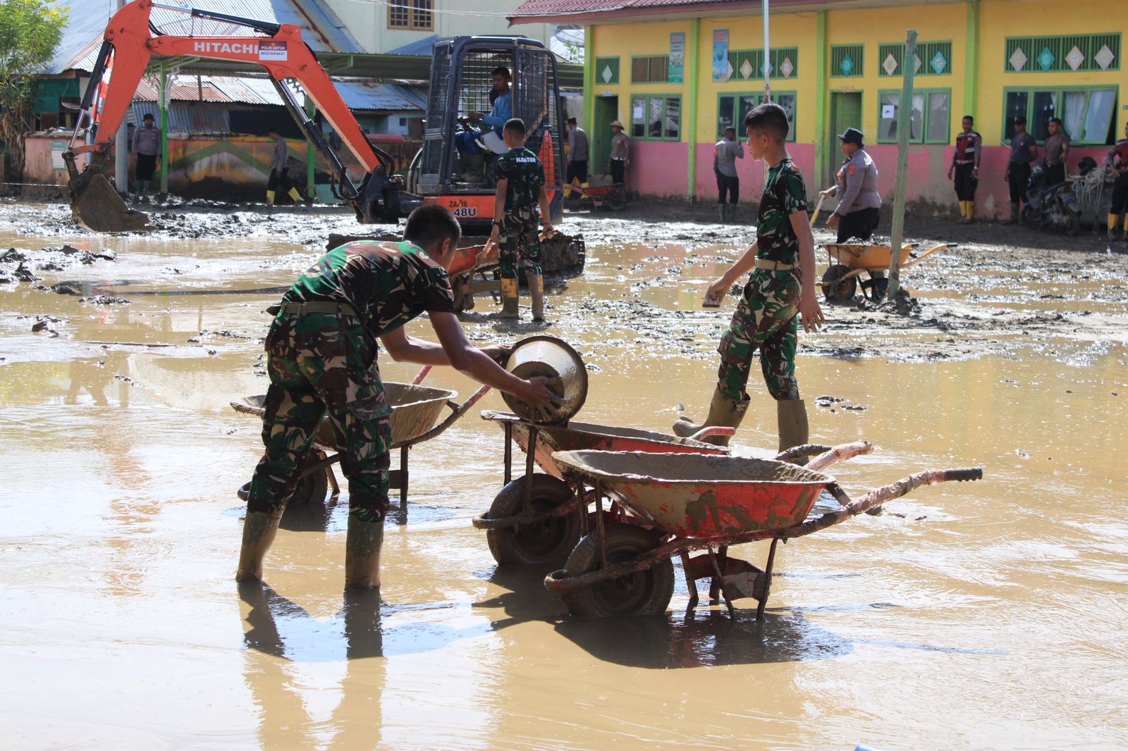 Setibanya di lokasi, personel Yonif TP 857/GG langsung melaksanakan pembersihan lumpur sisa banjir yang mengendap di halaman sekolah, ruang-ruang kelas, hingga saluran drainase. Dengan semangat kebersamaan dan gotong royong, para prajurit bekerja bahu-membahu menggunakan peralatan sederhana seperti cangkul, sekop, dan gerobak dorong guna mempercepat proses pembersihan.