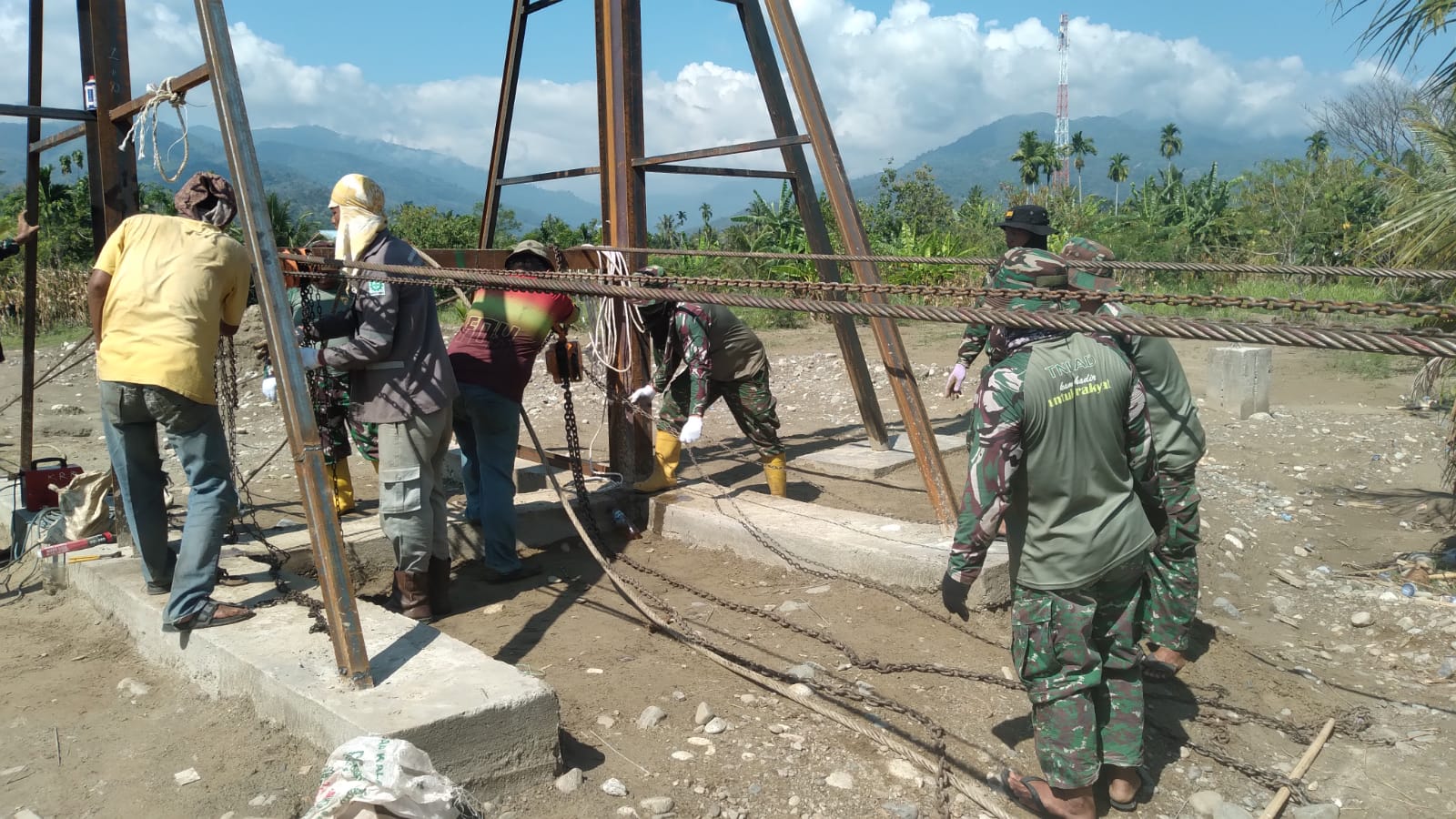 Danposramil Darul Hasanah Peltu Dedi Cahyadi bersama Babinsa turun langsung ke lapangan memimpin dan mengoordinasikan warga untuk pembangunan kegiatan meliputi penguatan tali sling pengikat tali jembatan dan memperkuat tiang pondasi jembatan terlihat Antusiasme warga terlihat tinggi, mencerminkan dukungan penuh terhadap program pemerintah yang bertujuan meningkatkan konektivitas dan kesejahteraan masyarakat pedesaan.