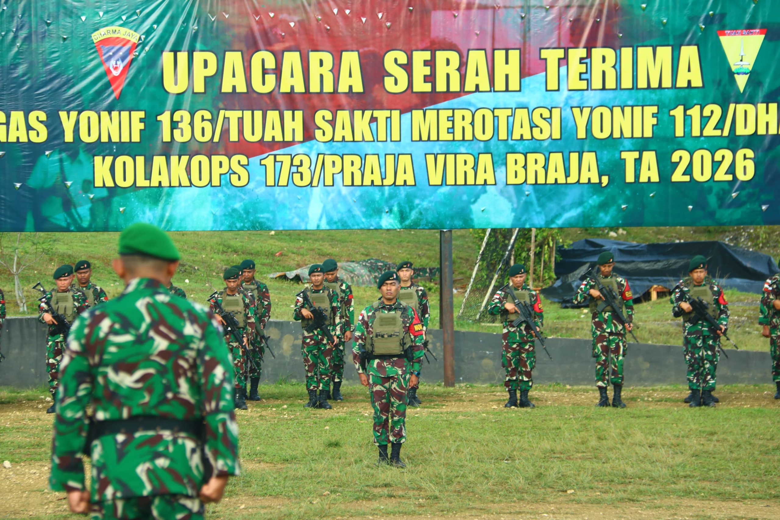 Biak Numfor – Upacara dalam rangka Serah Terima Satuan Tugas (Satgas) Pengamanan Perbatasan (Pamtas) Kewilayahan Yonif 112/DJ dengan Yonif 136/TS, berlangsung di lapangan upacara Yonif TP 858/MSB, Jumat (13/02/2026).