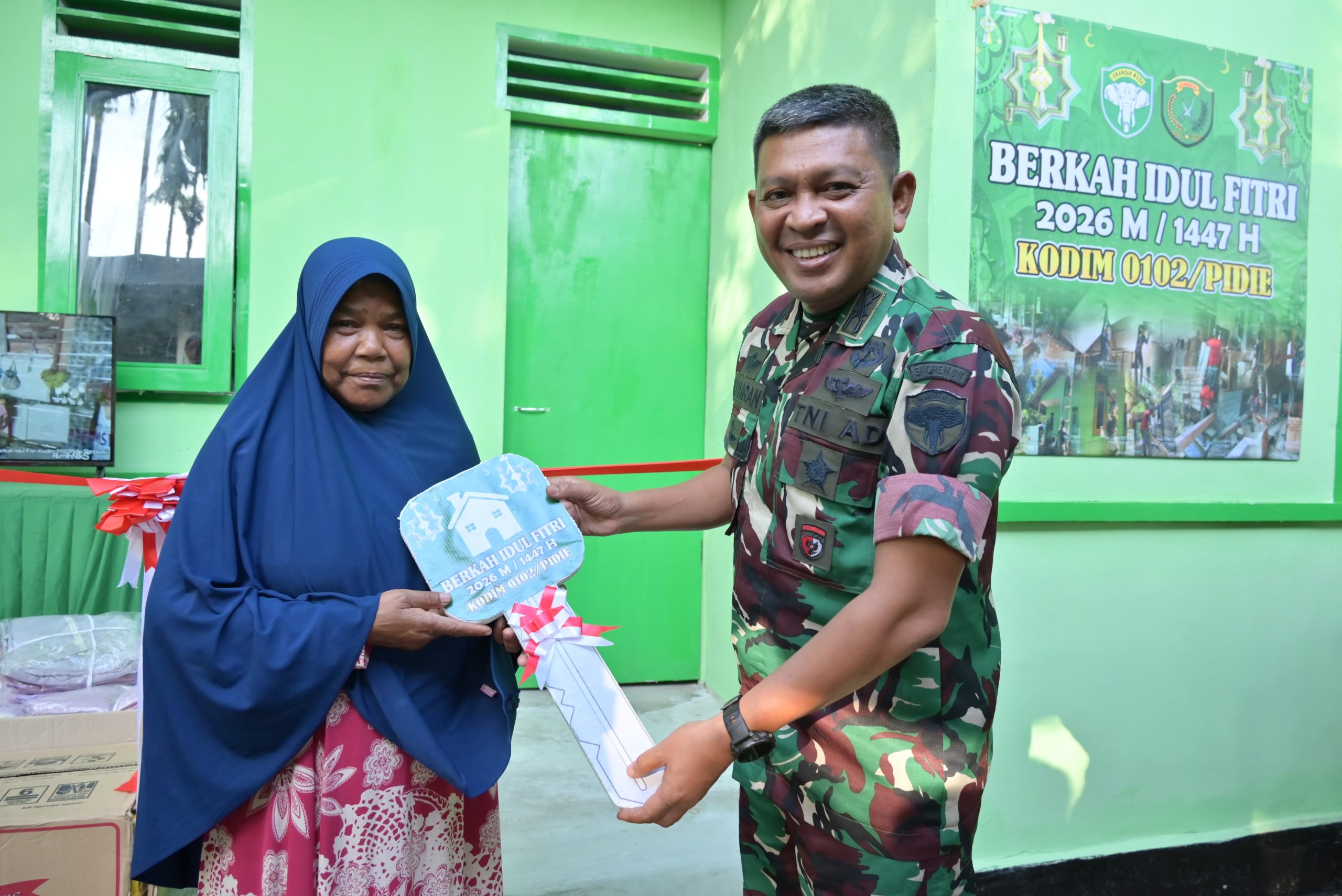 Pidie – Komandan Korem 011/Lilawangsa Kolonel Inf Ali Imran didampingi Komandan Kodim 0102/Pidie Letkol Inf Abdul Hadi, S.Sos., menyerahkan secara simbolis kunci rumah layak huni kepada Nek Syamsiah (70), warga Desa Blang Teungoh, Kecamatan Tangse, Kabupaten Pidie. Kegiatan tersebut juga dirangkaikan dengan buka puasa bersama masyarakat setempat . Senin (16/03/2026).